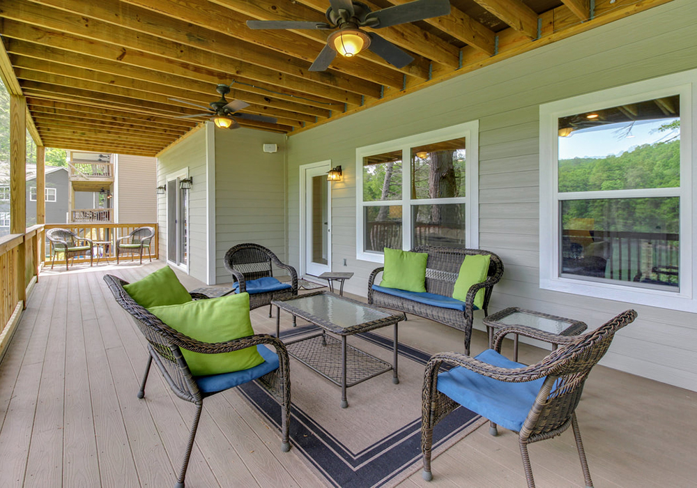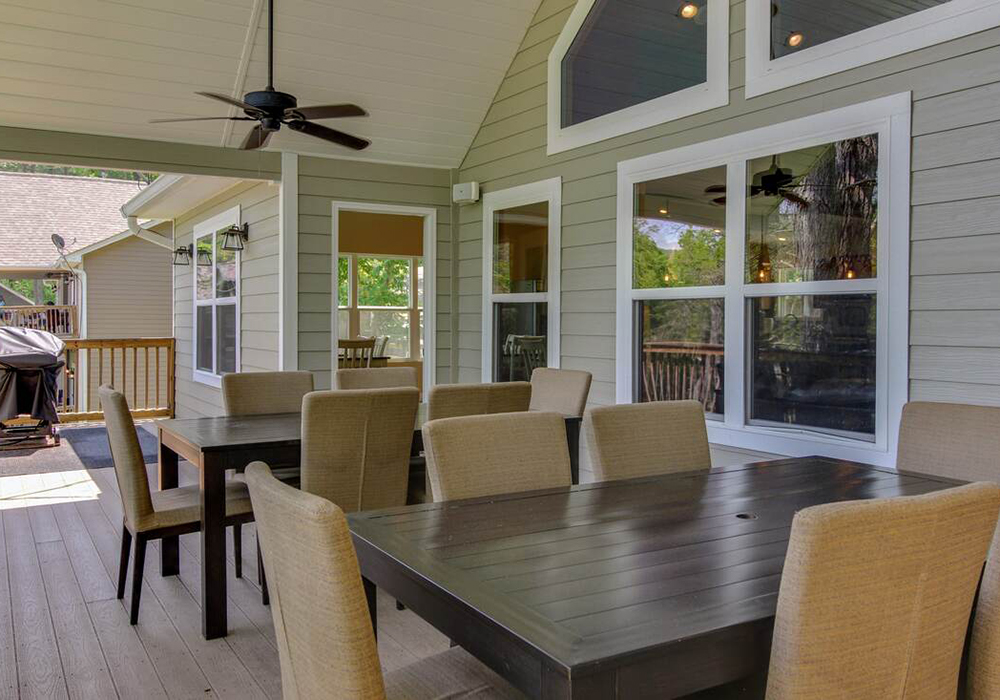 • The Large Covered Deck Overlooking the Lake Has 2 Large Dining Tables and Chairs